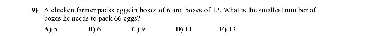 Q9. A chicken farmer packs eggs in boxes of 6 a nd boxes of 12. What is the smallest number of boxes he needs to pack 66 eggs?