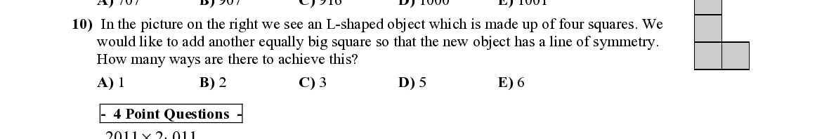 Q10. In the picture on the right we see an L-shaped object which is made up of four squares. We would like to add another equally big square so that the new object has a line of symmetry. How many ways are there to achieve this?