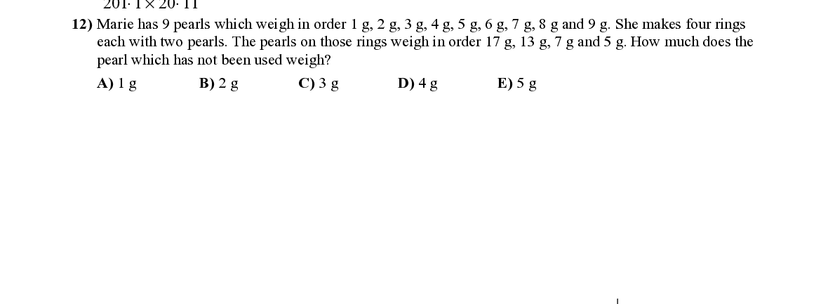 Q12. Marie has 9 pearls which weigh in order 1 g, 2 g, 3 g, 4 g, 5 g, 6 g, 7 g, 8 g and 9 g. She makes four rings each with two pearls. The pearls on those rings weigh in order 17 g, 13 g, 7 g and 5 g. How much does the pearl which has not been used weigh?