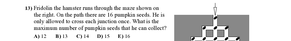 Q13. Fridolin the hamster runs through the maze shown on the right. On the path there are 16 pumpkin seeds. He is only allowed to cross each junction once. What is the maximum number of pumpkin s eeds that he can collect?