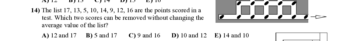 Q14. The list 17, 13, 5, 10, 14, 9, 12, 16 are the points scored in a test. Which two scores can be removed without changing the average value of the list?