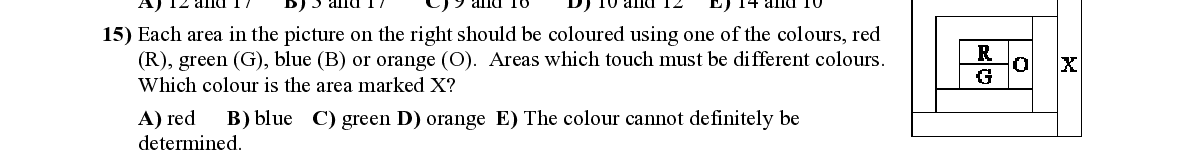 Q15. Each area in the picture on the right should be coloured using one of the colours, red (R), green (G), blue