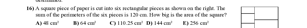 Q16. A square piece of paper is cut into six rectangular pieces as shown on the right. The sum of the perimeters of the six pieces is 120 cm. How big is the area of the square?