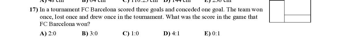 Q17. In a tournament FC Barcelona scored three goals and conceded one goal. The team won once, lost once and drew once in the tourname nt. What was the score in the game that FC Barcelona won?