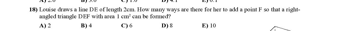 Q18. Louise draws a line DE of length 2cm. How many ways are there for her to add a point F so that a right- angled triangle DEF with area 1 cm² can be formed?