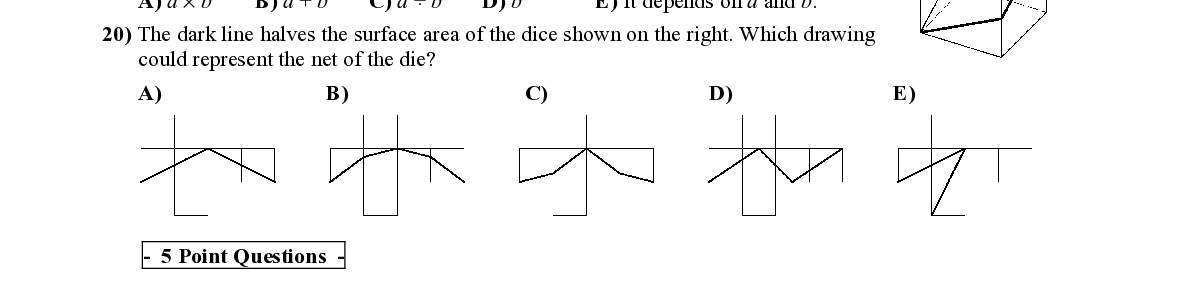 Q20. The dark line halves the surface area of the dice shown on the right. Which drawing could represent the net of the die?