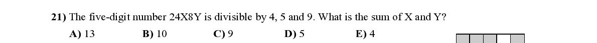 Q21. The five-digit number 24X8Y is divisible by 4, 5 and 9. What is the sum of X and Y?