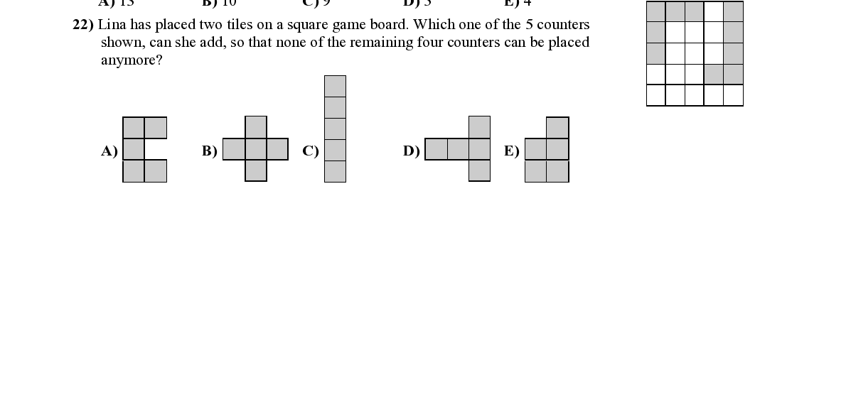 Q22. Lina has placed two tiles on a square ga me board. Which one of the 5 counters shown, can she add, so that none of the remaining four counters can be placed anymore?