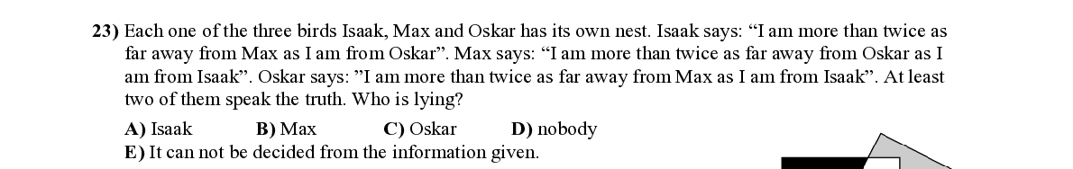 Q23. Each one of the three birds Isaak, Max and Oskar has its own nest. Isaak says: “I am more than twice as far away from Max as I am from Oskar”. Max says: “I am more than twice as far away from Oskar as I am from Isaak”. Oskar says: ”I am more than twice as far away from Max as I am from Isaak”. At least two of them speak the truth. Who is lying?