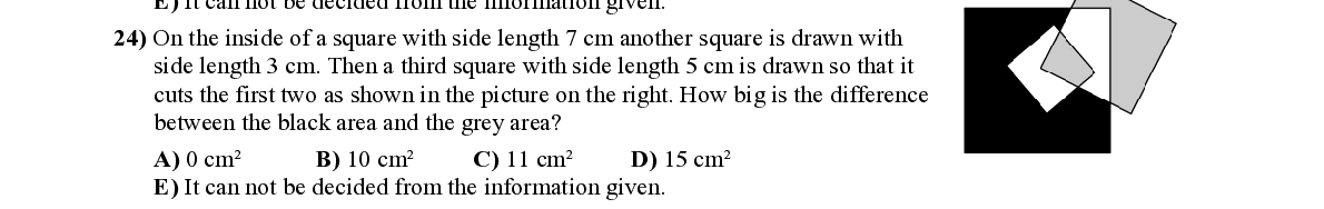 Q24. On the inside of a square with side length 7 cm another square is drawn with side length 3 cm. Then a third square with side length 5 cm is drawn so that it cuts the first two as shown in the picture on the right. How big is the difference between the black area and the grey area?