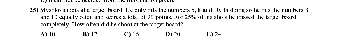 Q25. Myshko shoots at a target board. He only hits the numbe rs 5, 8 and 10. In doing so he hits the numbers 8 and 10 equally often and scores a total of 99 points. For 25% of his shots he missed the target board completely. How often did he shoot at the target board?