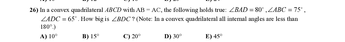 Q26. In a convex quadrilateral ABCD with AB = AC, the following holds true: ∠ BAD = 80 , ∠ ABC = 75 , ∠ ADC = 65 . How big is ∠ BDC ? (Note: In a convex quadrilateral all internal angles are less than