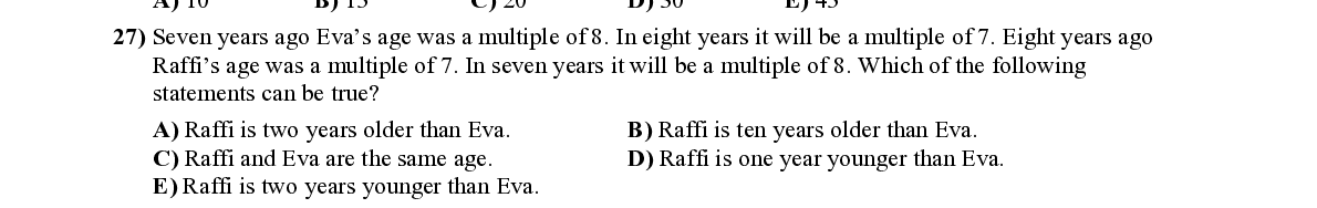 Q27. Seven years ago Eva’s age was a multiple of 8. In ei ght years it will be a multiple of 7. Eight years ago Raffi’s age was a multiple of 7. In seven years it will be a multiple of 8. Which of the following statements can be true?