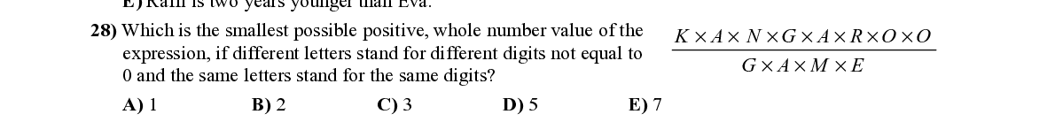 Q28. Which is the smallest possible positive, whole number value of the K × A × N × G × A × R × O × O expression, if different letters stand for different digits not equal to G × A × M × E 0 and the same letters stand for the same digits?