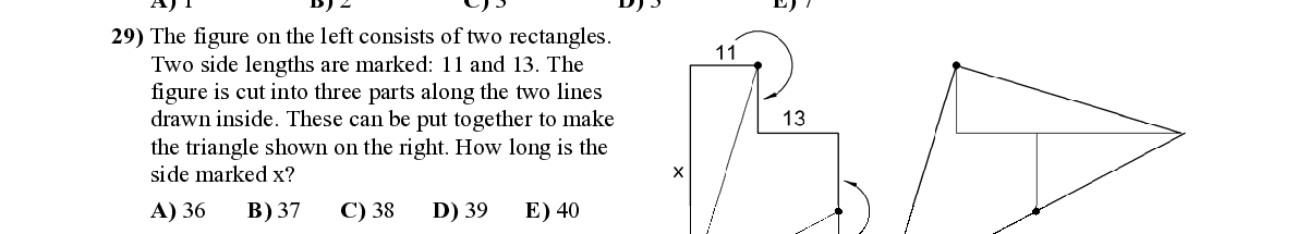 Q29. The figure on the left consists of two rectangles. Two side lengths are marked: 11 and 13. The figure is cut into three parts along the two lines drawn inside. These can be put together to make the triangle shown on the right. How long is the side marked x?