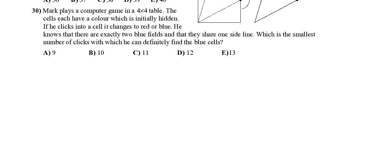Q30. Mark plays a computer game in a 4 × 4 table. The cells each have a colour which is initially hidden. If he clicks into a cell it changes to red or blue. He knows that there are exactly two blue fields and that they share one side line. Which is the smallest number of clicks with which he can definitely find the blue cells?