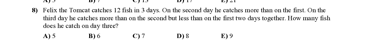 Q8. Felix the Tomcat catches 12 fish in 3 days. On the second day he catches more than on the first. On the third day he catches more than on the second but less than on the first two days together. How many fish does he catch on day three?