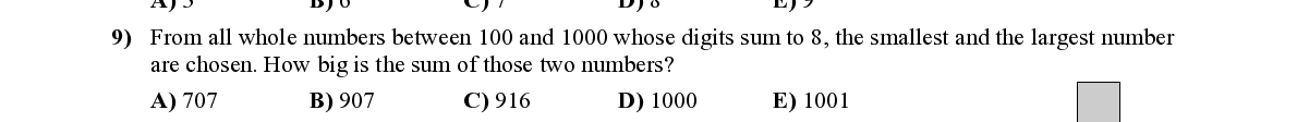 Q9. From all whole numbers between 100 and 1000 whose dig its sum to 8, the smallest and the largest number are chosen. How big is the sum of those two numbers?