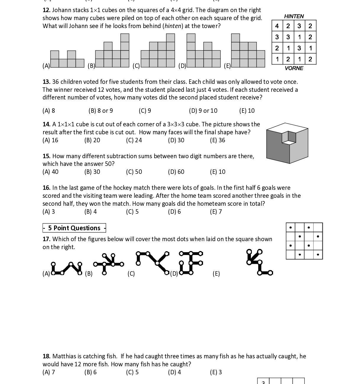 Q12. Johann stacks 1 × 1 cubes on the squares of a 4 × 4 grid. The diagram on the right shows how many cubes were piled on top of each other on each squa re of the grid. What will Johann see if he looks from behind ( hinten ) at the tower?