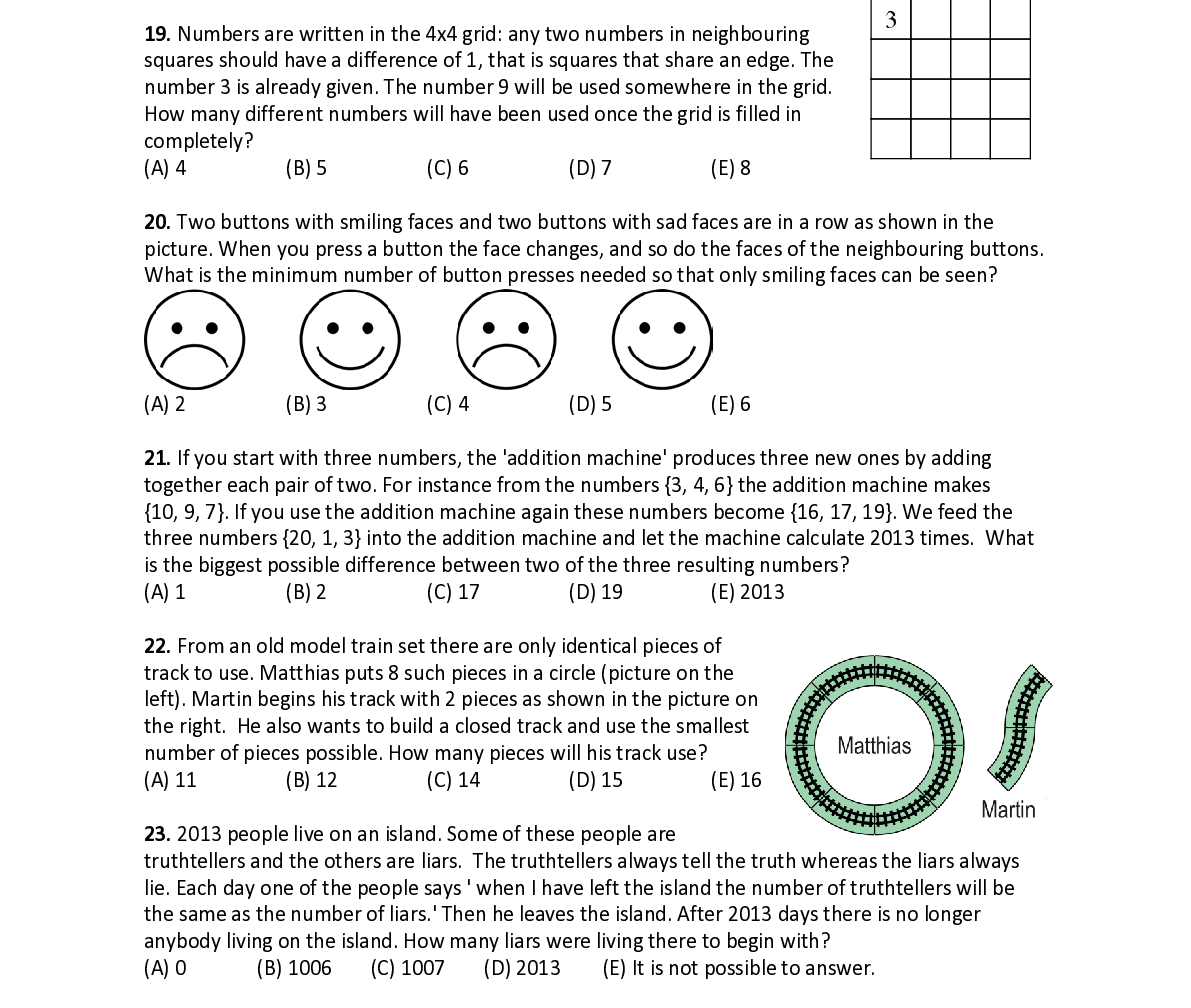 Q23. 2013 people live on an island. Some of these peo ple are truthtellers and the others are liars. The truthtellers always tell the truth wher eas the liars always lie. Each day one of the people says ' when I have left the island the number of truthtellers will be the same as the number of liars.' Then he leaves the island. After 2013 days there is no longer anybody living on the island. How man y liars were living there to begin with?