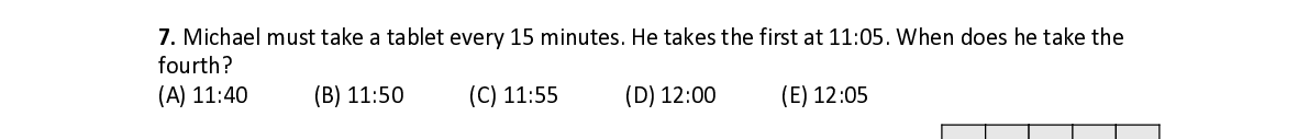 Q7. Michael must take a tablet every 15 minutes. He takes the first at 11:05. When does he take the fourth?