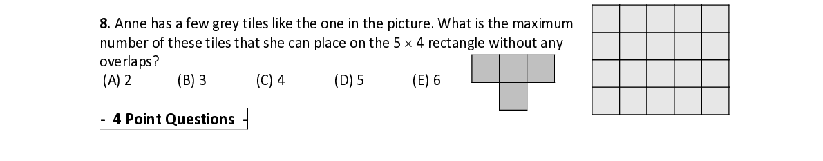 Q8. Anne has a few grey tiles like the one in the picture. What is the maximum number of these tiles that she can place on the 5 × 4 rectangle without any overlaps?