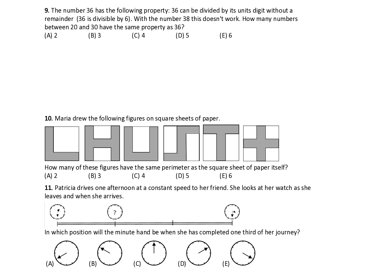 Q11. Patricia drives one afternoon at a constant speed to her friend. She looks at her watch as she leaves and when she arrives. In which position will the minute hand be when she has completed one third of her journey?