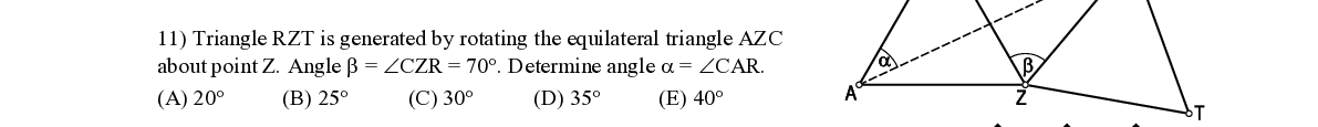 Q11. Triangle RZT is generated by rotating the equilateral triangle AZC about point Z. Angle β = ∠ CZR = 70°. Determine angle α = ∠ CAR.