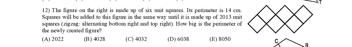 Q12. The figure on the right is made up of six unit squares. Its perimeter is 14 cm. S quares will be added to this figure in the same way until it is made up of 2013 unit squares (zigzag: alternating bottom right and top right). How big is the perimeter of the newly created figure ?