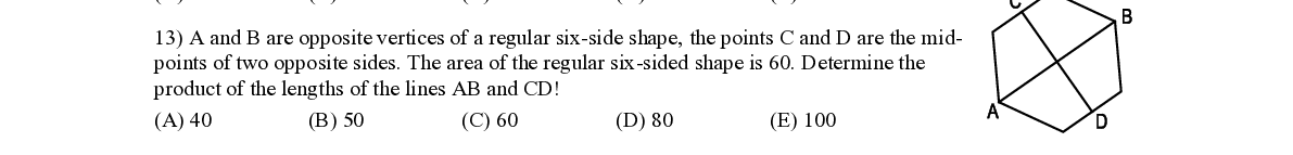 Q13. A and B are opposite vertices of a regular six - side shape, the points C and D are the mi d- points of two opposite sides . The area of the regular six - sided shape is 60. Determine the product of the lengths of the lines AB and CD!