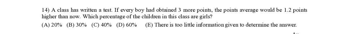 Q14. A class has written a test. If every boy had obtained 3 more points , the points average would be 1.2 points higher than now . Which percentage of the children in this class are girls ?