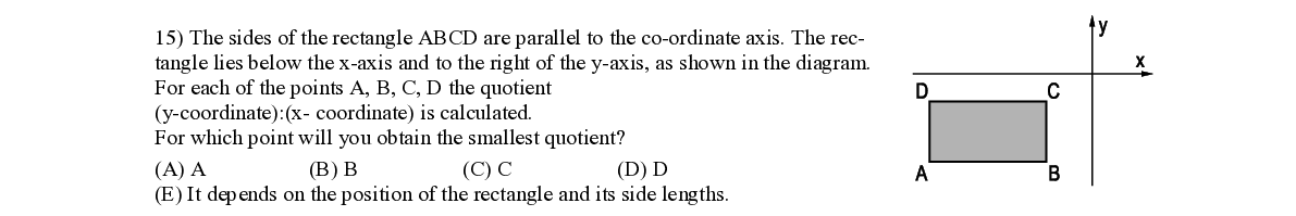 Q15. The sides of the rectangle ABCD are parallel to the co - ordinate axis. The re c- tangle lies below the x - axis and to the right of the y - axis, as shown in the diagram. F or each of the points A, B, C, D the quotient (y - coordinate):(x - coordinate) is calculated . F or which point will you obtain the smallest quotient?