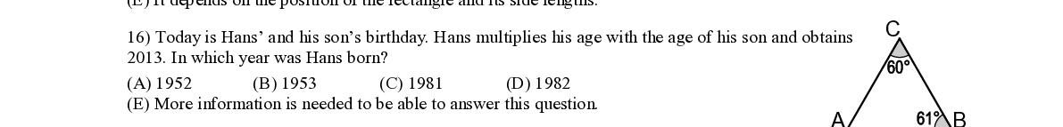 Q16. Today is Hans’ and his son’s birthday. Hans multiplies his age with the age of his son and obtains C