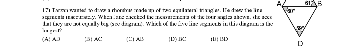 Q17. Tarzan wanted to draw a rhombus made up of two equilateral triangles. He drew the line segments inaccurately. When Jane checked the measurements of the four angles shown, she sees that they are not equally big (see diagram). Which of the five line s egments in this diagram is the longest?