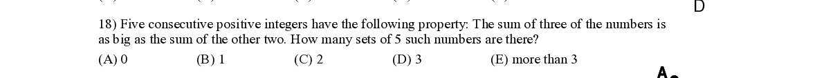 Q18. Five consecutive positive integers have the following property: T he sum of three of the number s is as big as the sum of the other two . How many sets of 5 such numbers are there?