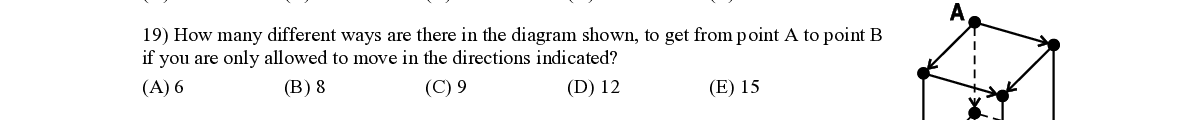Q19. How many different ways are there in the diagram shown , to get from point A to point B if you are only allowed to move in the directions indicated?