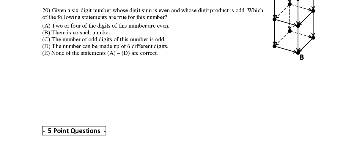 Q20. Given a six - digit number whose digit sum is even and whose digit product is odd. Which of the following statements are true for this number ?