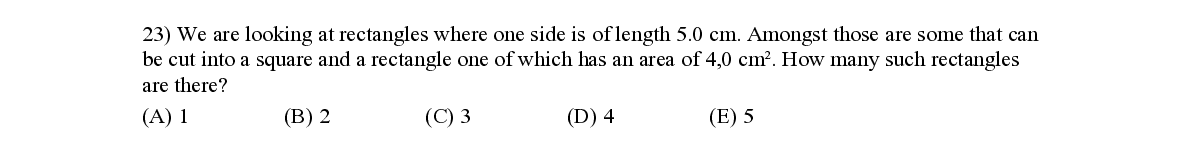Q23. We are looking at rectangles where one side is of length 5.0 cm. Amongst those are some that can be cut into a square and a rectangle one of which has an area of 4,0 cm². How many such rectangles are there ?