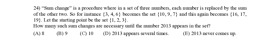 Q24. “Sum change” is a procedure wher e in a set of three numbers , each number is replaced by the sum of the other two. So for instance {3, 4, 6} becomes the set {10, 9, 7} and this again becomes {16, 17,
