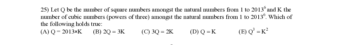 Q25. Let Q be the number of square numbers amongst the natural numbers from 1 to 2013 and K the 6 number of cubic numbers (powers of three) amongst the natural numbers from 1 to 2013 . Which of the following holds true : 3 2