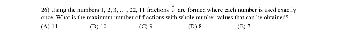 Q26. Using the numbers 1, 2, 3, …, 22, 11 fractions b are formed where each number is used ex a ctly once. What is the maximum number of fractions with whole number values that can be obtained?