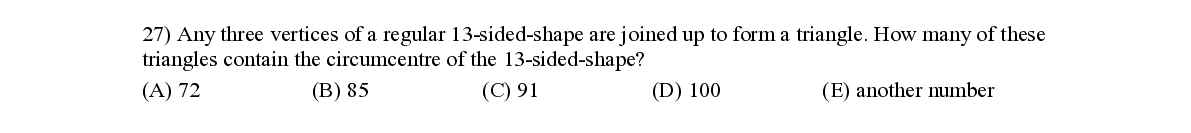 Q27. Any three vertices of a regular 13 - sided - shape are joined up to form a triangle. How many of these triangles contain the circumcentre of the 1 3 - sided - shape ?