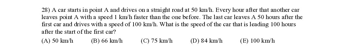 Q28. A car starts in point A and drives on a straight road at 50 km/h. Every hour after that another car leaves point A with a speed 1 km/h faster than the one before. The last car leaves A 50 hours after the first car and drives with a speed of 100 km/h. What is the speed of the car that is leading 100 hours after the start of the first car?