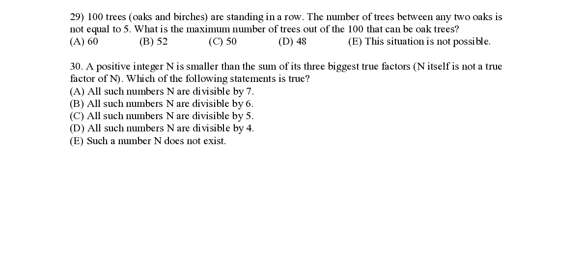 Q29. 100 trees (oaks and birches) are standing in a row. The number of trees between any two oaks is not equal to 5. What is the maximum number of trees out of the 100 that can be oak trees?