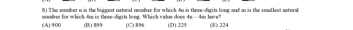 Q8. The number n is the biggest natural number for which 4n is three - digits long and m is the smallest natural number for which 4m is three - digits long. Which value does 4n – 4m have?