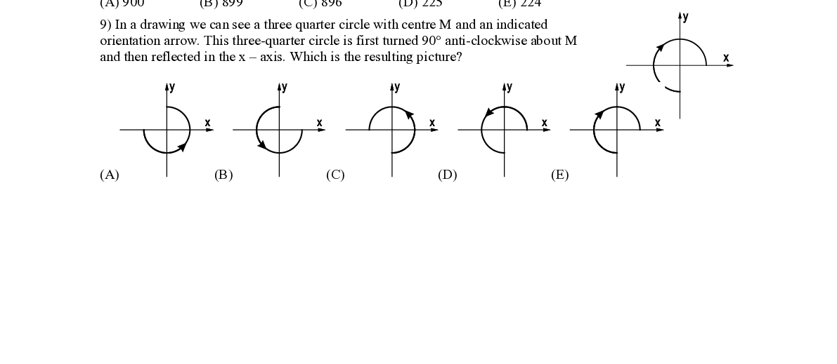 Q9. In a drawing we can see a three quarter circle wi th centre M and an indicated orientation arrow. This three - quarter circle is first turned 90° anti - clockwise about M and then reflected in the x – axis. Which is the resulting picture ?