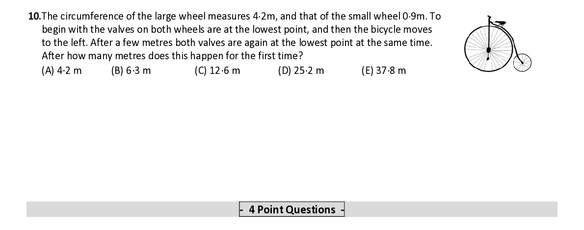 Q10. The circumference of the large wheel measures 4 ⋅ 2m, and that of the small wheel 0 ⋅ 9m. To begin with the valves on both wheels are at the lowest point, and then the bicycle moves to the left. After a few metres both valves are again at the lowest point at the same time. After how many metres does this happen for the first time?