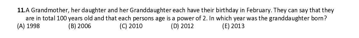 Q11. A Grandmother, her daughter and her Granddaughter each have their birthday in February. They can say that they are in total 100 years old and that each persons age is a power of 2. In which year was the granddaughter born?