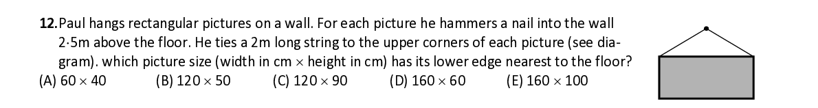 Q2. ⋅ 5m above the floor. He ties a 2m long string to th e upper corners of each picture (see di a- gram). which picture size (width in cm × height in cm) has its lower edge nearest to the floor?