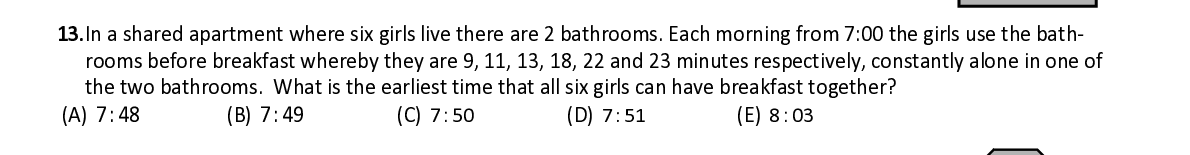 Q13. In a shared apartment where six girls live there are 2 bathrooms. Each morning from 7:00 the girls use the bat h- rooms before breakfast whereby they are 9, 11, 13, 18, 22 and 23 minutes respectively, constantly alone in one of the two bathrooms. What is the earliest time that all six girls can have breakfast together?